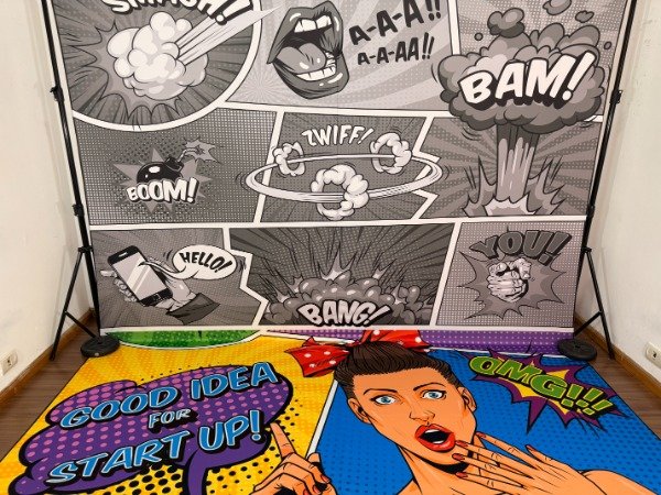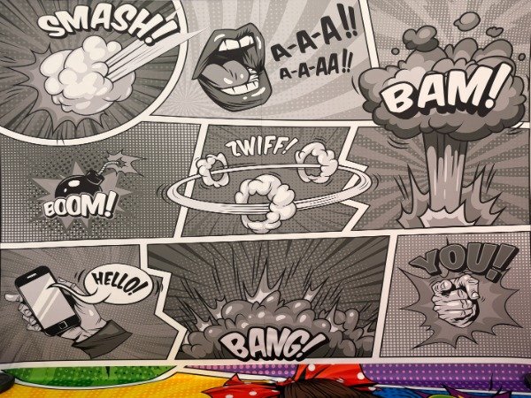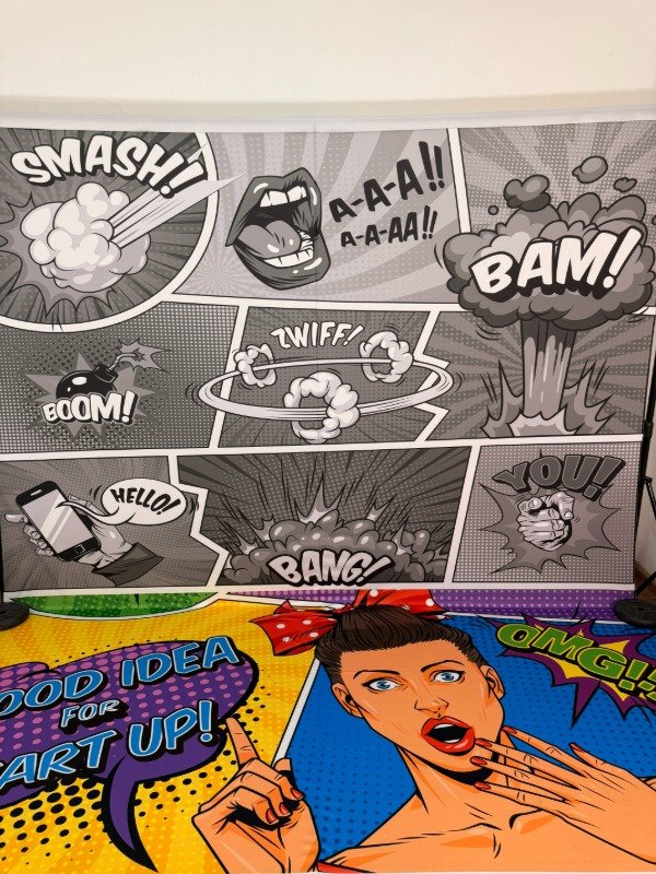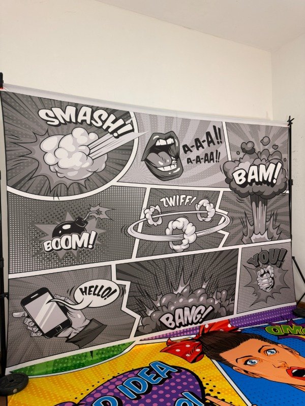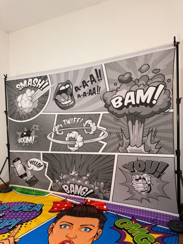 💥 ¡BOOM! Fondo de pared inspirado en una viñeta de cómic retro en escala de grises, repleto de onomatopeyas icónicas (SMASH, BAM, A-A-AA!!) y efectos de acción. Ideal para fotografía de producto, retratos originales, photocalls temáticos de superhéroes o eventos con estilo Arte Pop audaz. Un diseño versátil que da un toque dinámico y cinematográfico a cualquier sesión.