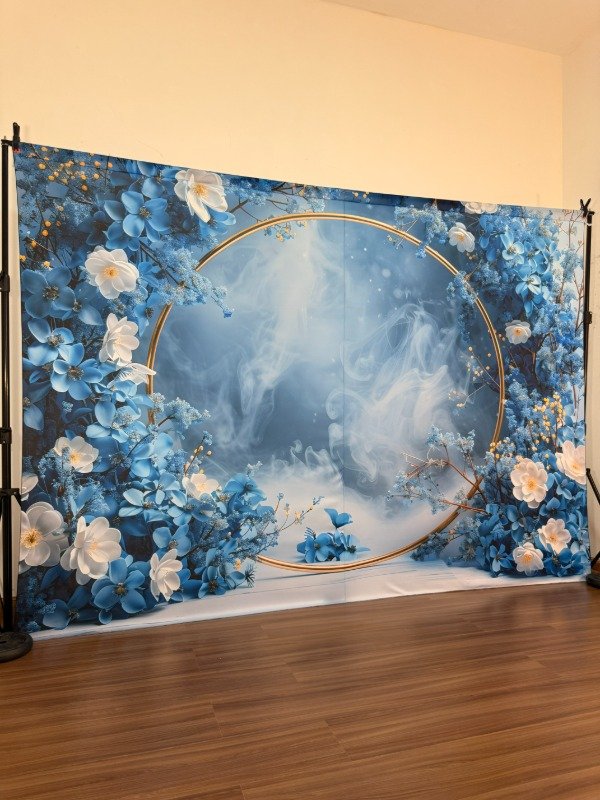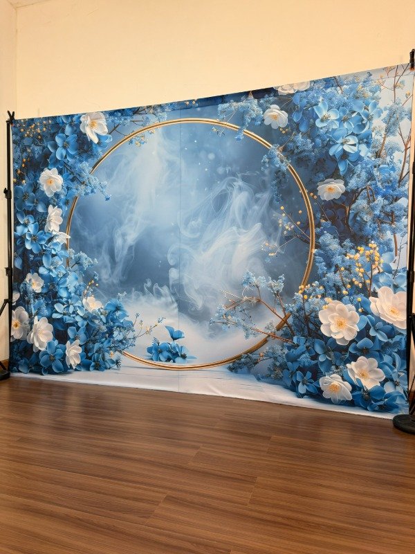 ❄️ Elegante fondo estilo Boho Floral en tonos azules y blancos, dominado por un impactante aro dorado central rodeado de flores y ramas con un efecto de bruma etérea. Ideal para sesiones de maternidad, retratos de fantasía, cumpleaños temáticos de invierno o quinceañeras. Su paleta de colores fríos y el detalle metálico aportan sofisticación y un toque mágico.