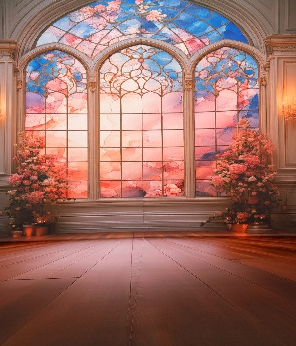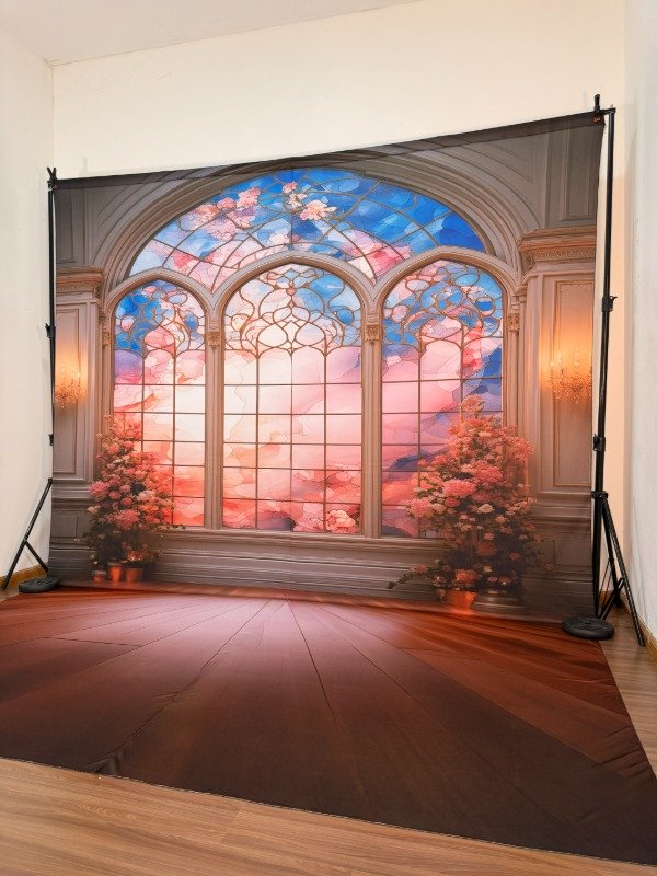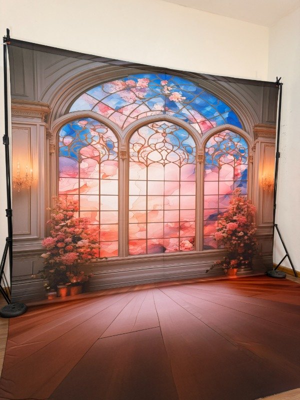 ✨ Escenario de ensueño con un majestuoso Ventanal de Vidrieras Artísticas que evoca una catedral gótica, bañando la escena en tonos rosados, corales y celestes. Ideal para sesiones de ceremonia religiosa (Bautizos, Primeras Comuniones, Bodas), retratos elegantes o fotografía fine art. El diseño incluye un piso de madera a juego y arreglos florales laterales, creando una atmósfera de calidez, luz y solemnidad. Fabricado en tela Innova que anula el rebote del flash, asegurando la fidelidad de los colores vibrantes y la textura del vitral.