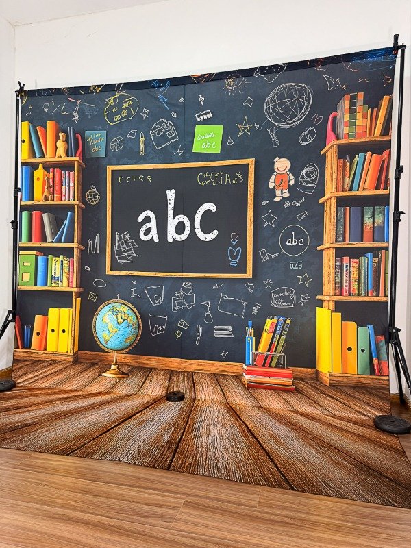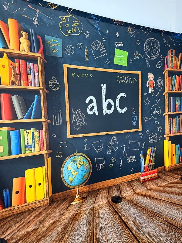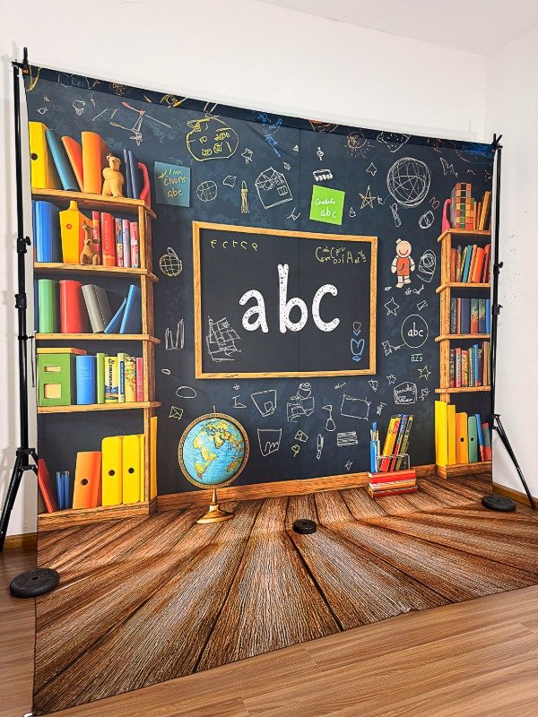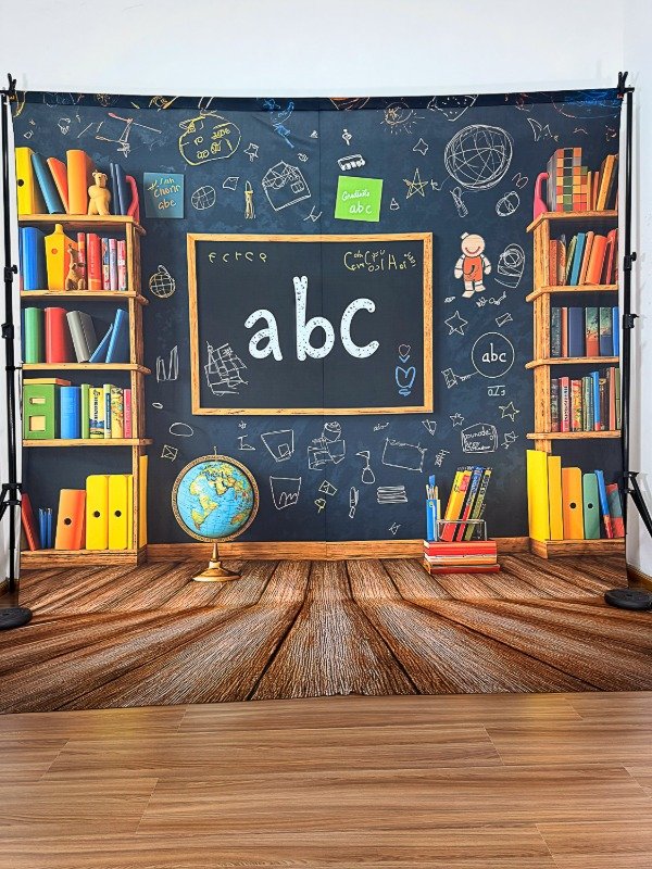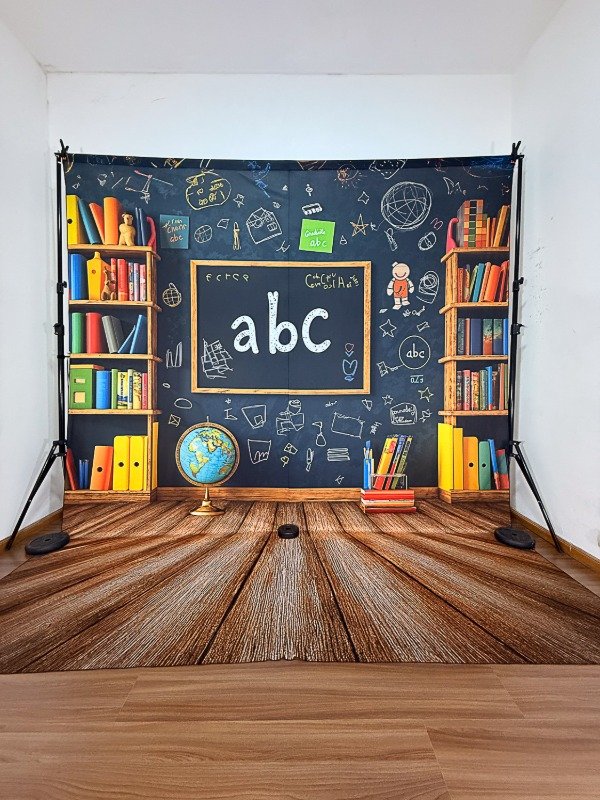 👩🎓 Fondo escolar con un gran Pizarrón de Tiza central, enmarcado por estanterías repletas de libros, un globo terráqueo y dibujos escolares. El piso de madera le añade calidez y profundidad.